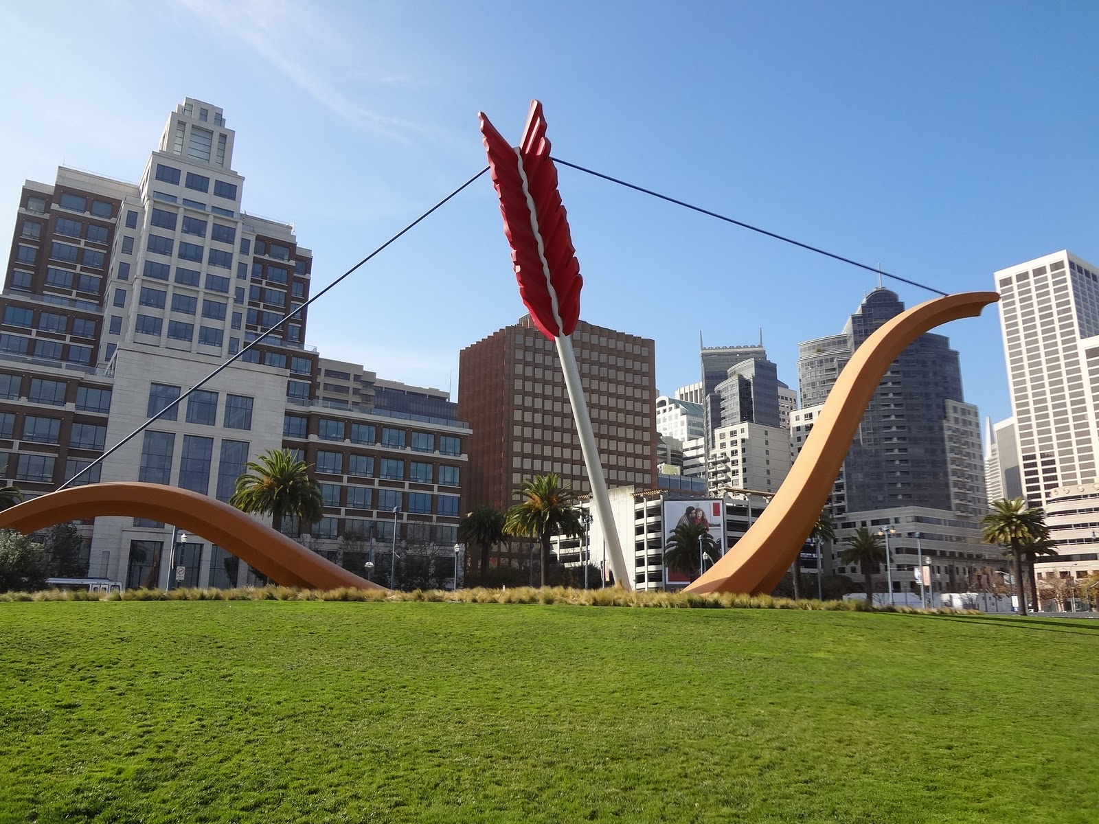 This photo is not of Rincon Park, but of the Flaming Lotus Girls’ interactive public sculpture Soma that sits about 150 feet away at Pier 14. After dark, you can fiddle with the buttons on this sculpture to create dynamic color displays that play beautifully against the Bay Lights-illuminated Bay Bridge. But please don’t hang on the sculpture and please do hide your drugs when kids inevitably come rolling by. Across the street, Rincon Park remains an excellent place to smoke pot and contemplate ‘Why the fuck did someone put up a giant bow-and-arrow statue?”